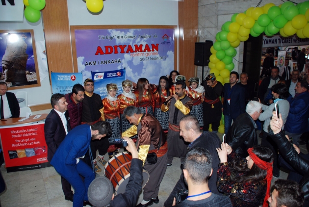 Türkiye'nin Güneşi Ankara'da sloganıyla Adıyaman Valiliği tarafından organize edilen ve bu yıl üçüncüsü Ankara Atatürk Kültür Merkezinde düzenlenen "Adıyaman Tanıtım Günlerinin ikinci günü büyük bir coşkuyla devam ediyor.Tanıtım Günlerinin ikinci günü Adıyaman Halkoyunları gösterileri ile başladı. Adıyaman Valiliği tarafından düzenlenen Adıyaman Tanıtım Günleri programı kapsamında, Adıyamanlı sanatçılardan Latif Doğan ve Kahtalı Mıçı sahne alarak seslendirdiği birbirinden güzel parçalarla gelen davetlileri coşturdu. Etkinlikler kapsamında ayrıca, Adıyaman Halkoyunları Ekibi ile Kahta Halkoyunları Davul Show ekibi tarafından da gösteriler sunuldu.Tanıtım günlerinde sergilenen yöresel ürünler ile meşhur Adıyaman çiğköftesi Başkentlilerden büyük beğeni aldı. Adıyaman mutfağına has yemekleri ve tarımsal ürünlerini tadan davetliler, bütün stantları tek gezerek Adıyaman'ın tarihi ve turistik mekanlarını gösteren stantları gezerek bol bol fotoğraf çektirdi.23 Nisan Pazar gününe kadar sürecek olan etkinlikte Adıyaman Valisi Abdullah Erin, tanıtım günlerine katılan misafirlerine yakın ilgi göstererek, Adıyaman yöresel ürünlerinin sergilendiği stantları gezdirip, ilin sahip olduğu değerlerle ilgili bilgi verdi.Programın ikinci gününde Ressam Ayşe Işık, canlı performans göstererek, sergi salonunda ayaklarıyla resim çizimi yaptı.