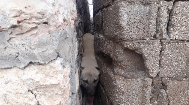 Olay yerine gelen köylüler köpeği duvar arasında sıkıştığını görünce kazma ve kürek ile yaklaşık 1 saat süren çalışmanın ardından sıkıştığı yerden çıkartıldı.
